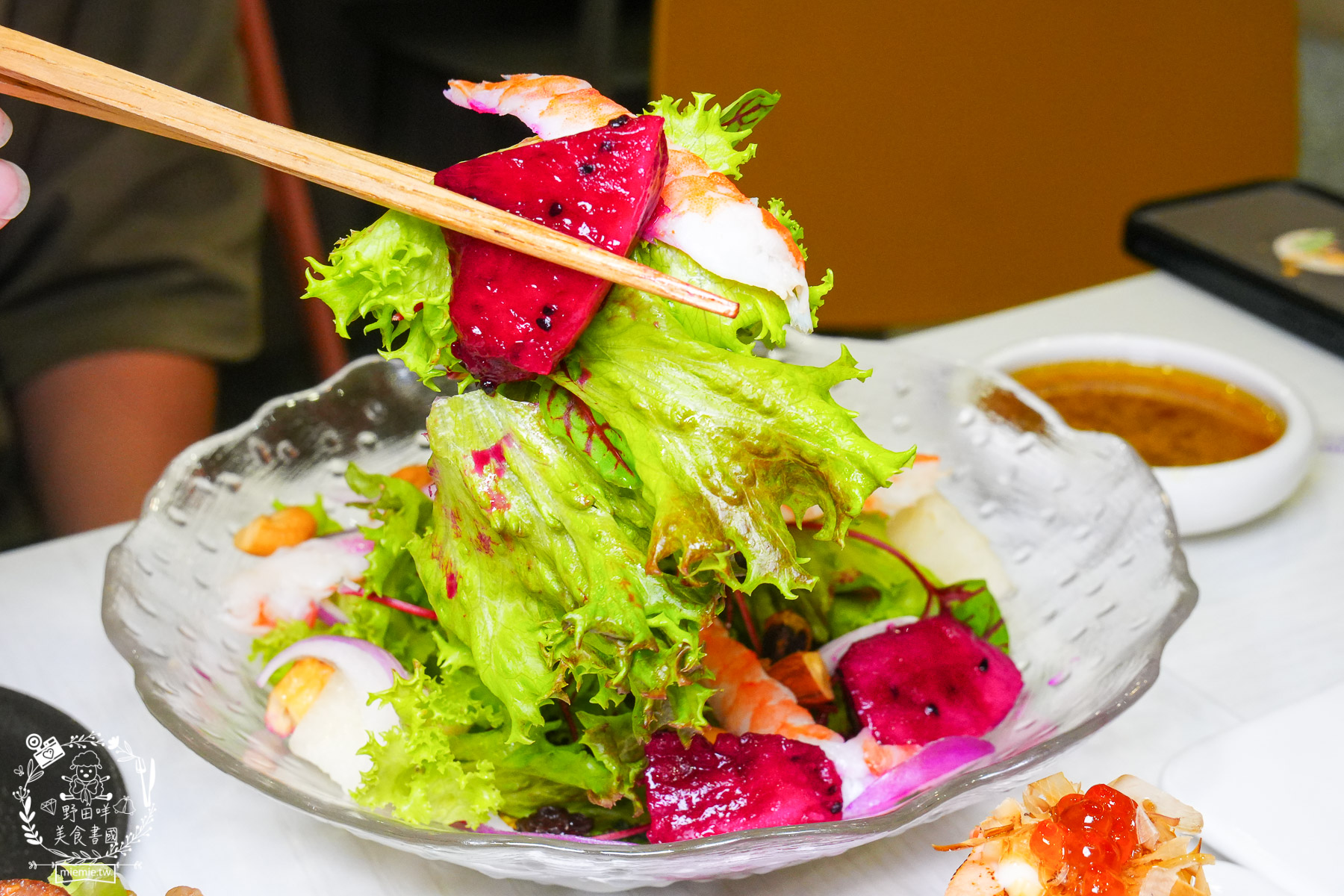 旭豐壽司的大蝦生菜沙拉搭配的是油醋醬,所以整體酸味十足,而且清脆爽口,搭配火龍果跟梨子很香甜。