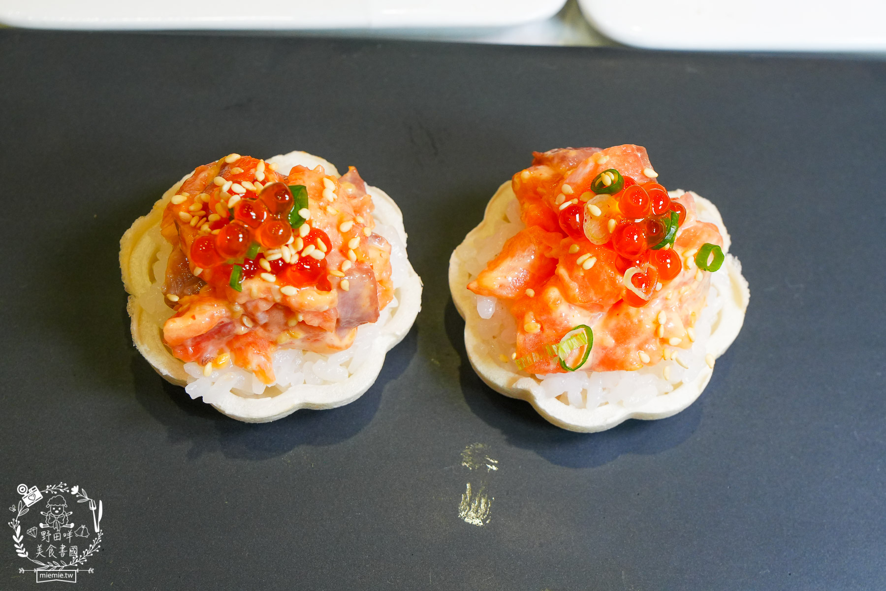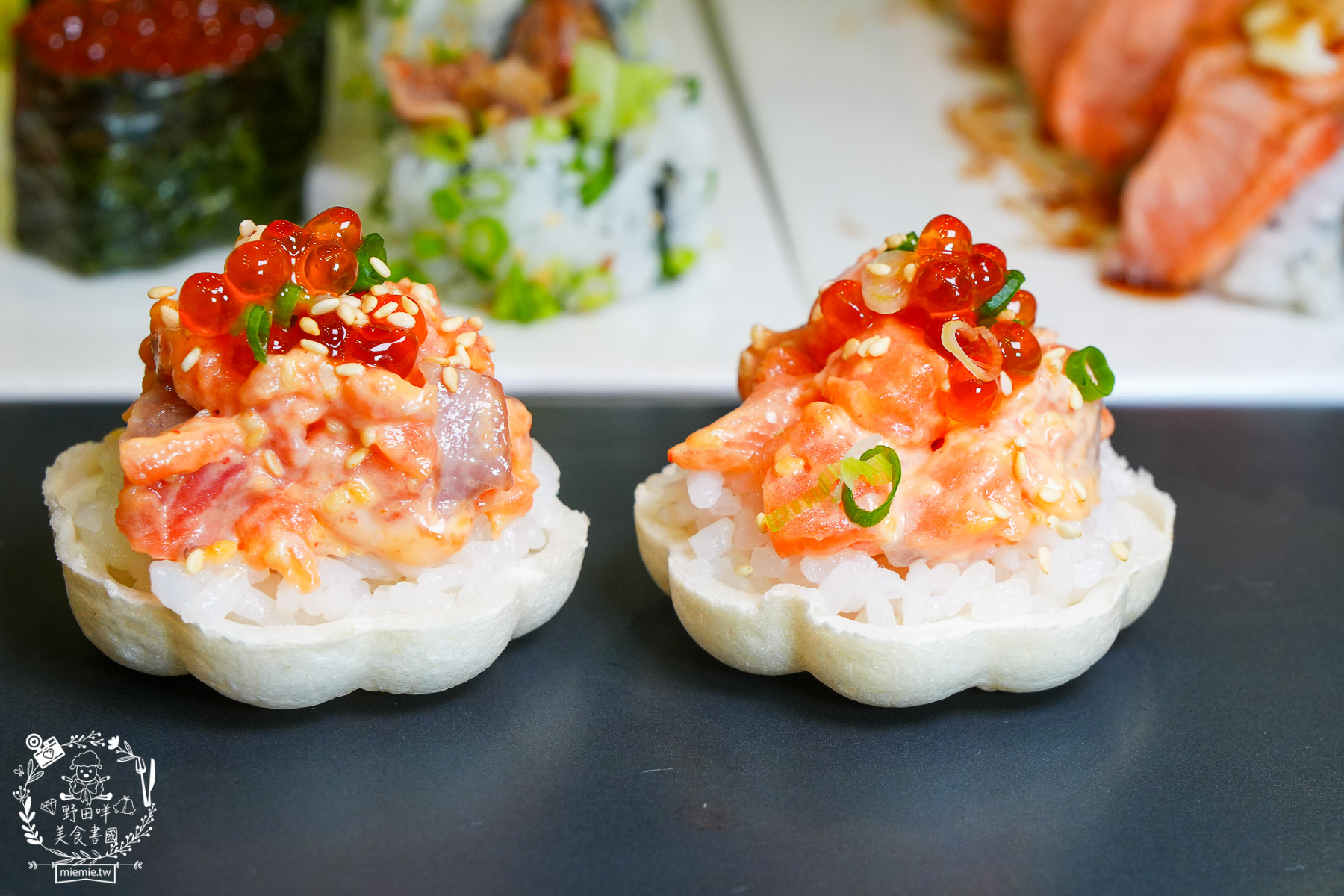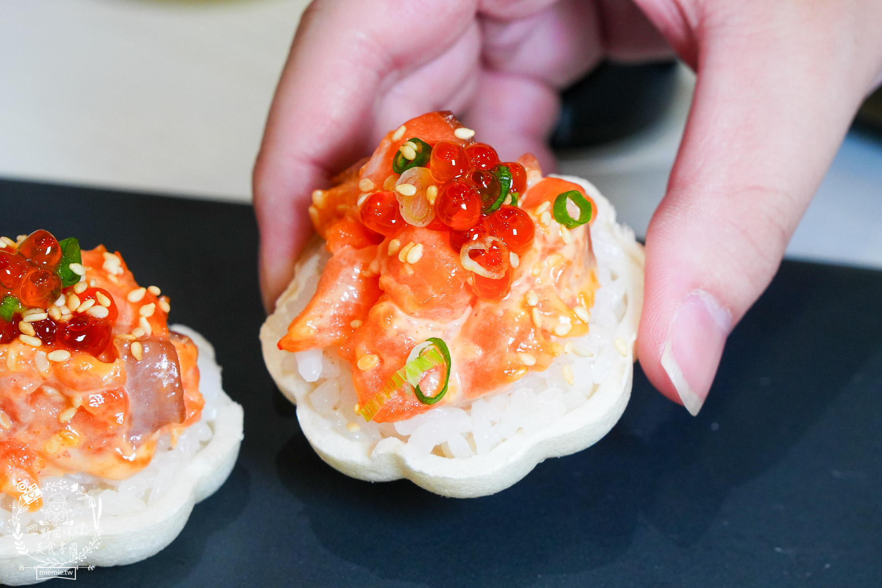 滿載而鮭很特別,採用口感豐富又有滿滿油花的鮭魚丁,結合鮭魚卵,底部是餅乾承裝粒粒分明的日本越光米醋飯,讓這道壽司非常有藝術感。