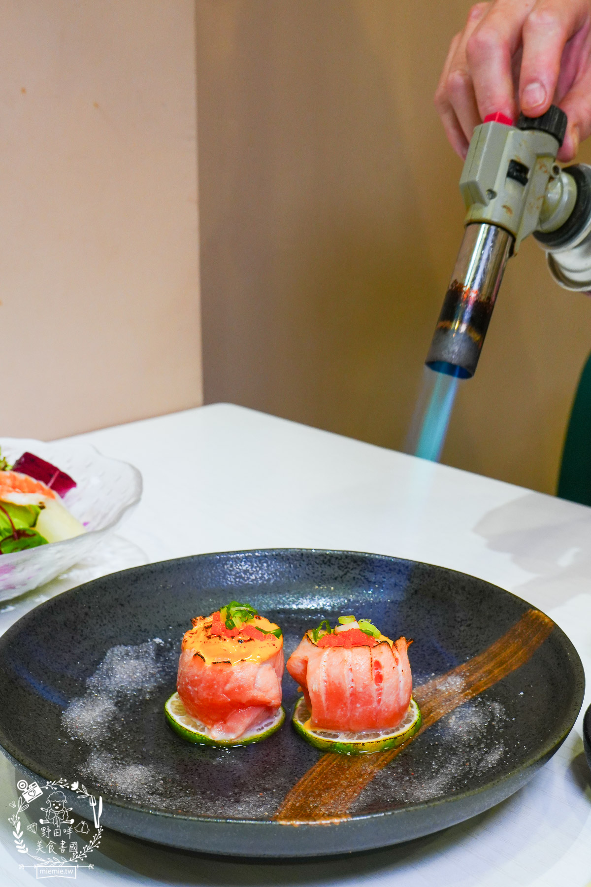 這個火焰持續蠻久的,也讓鮭魚生魚片有被炙燒過的效果唷。