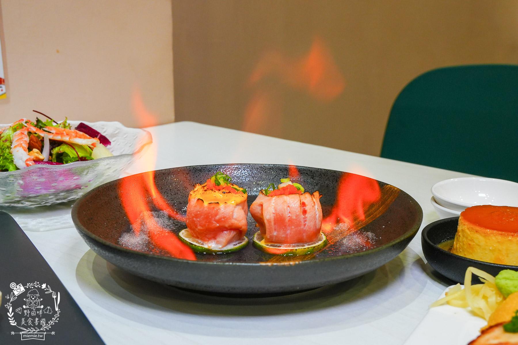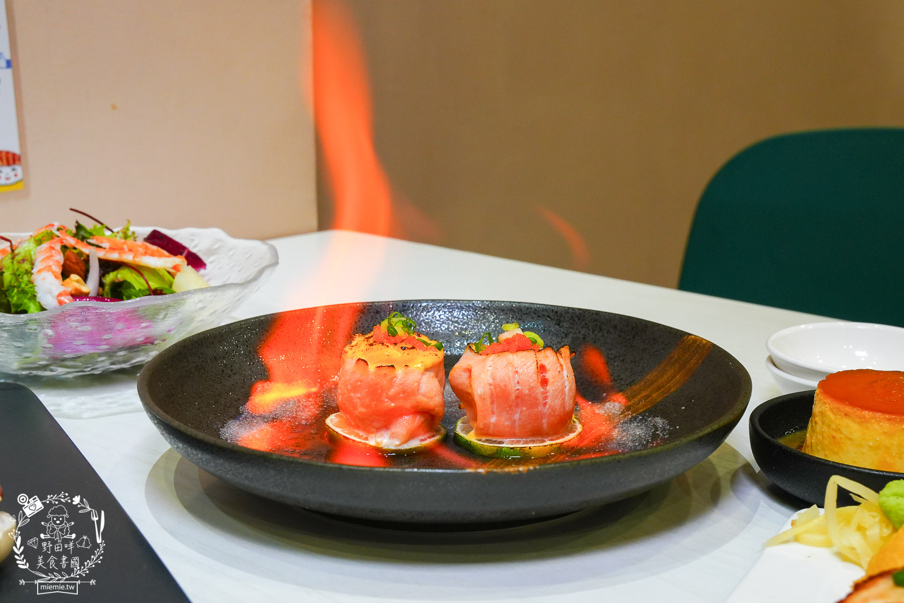 將新鮮的鮭魚結合濃郁的起司醬與魚子醬、蔥花完美融合,旁邊搭配上獨特的蒸餾酒與海鹽進行火焰燒烤,讓這道菜色在桌前上演一場充滿視覺震撼的火焰秀,才有照片中那種卡西法的感覺。XD