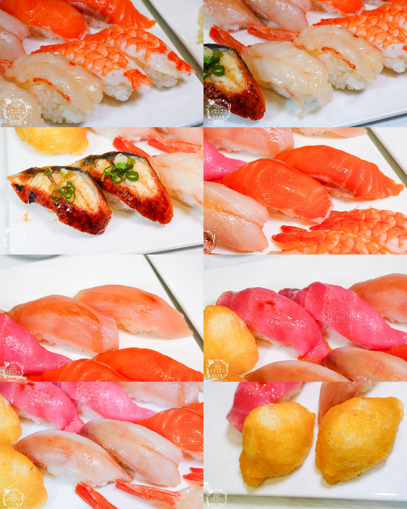 澎湃組合有鮭魚、鮪魚、旗魚、青干、大蝦、赤蝦、鰻魚、蘆筍蝦手捲、黃金泡菜豬肉捲、豆皮壽司,還有鮭魚卵、魚子醬、龍蝦沙拉軍艦壽司,可以說是超級豐富的組合唷。